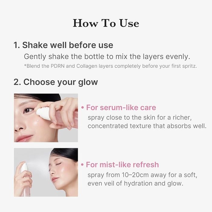 • Серум шиг арчилгаа авахыг хүсвэл: Сэгсэрч ойрхон шүршиж, арьсанд гүн шингэх өтгөн бүтэцтэйгээр хэрэглэнэ.