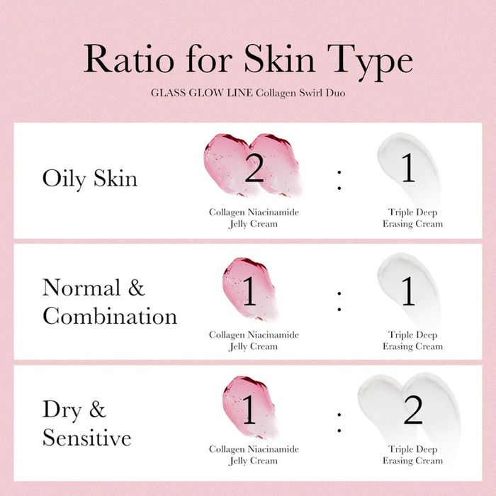 Өөрийн хэрэгцээнд тохируулан ашиглаж болох коллагентай арьс арчилгааны хослол нь эрүүл харагдах, чийглэг гялалзсан төрхийг бий болгоно. Арьсны төрөлдөө тохируулан коллаген ниацинамидтай желе тос болон гурвалсан коллагентай тосыг зохистой харьцаагаар хольж хэрэглээрэй.