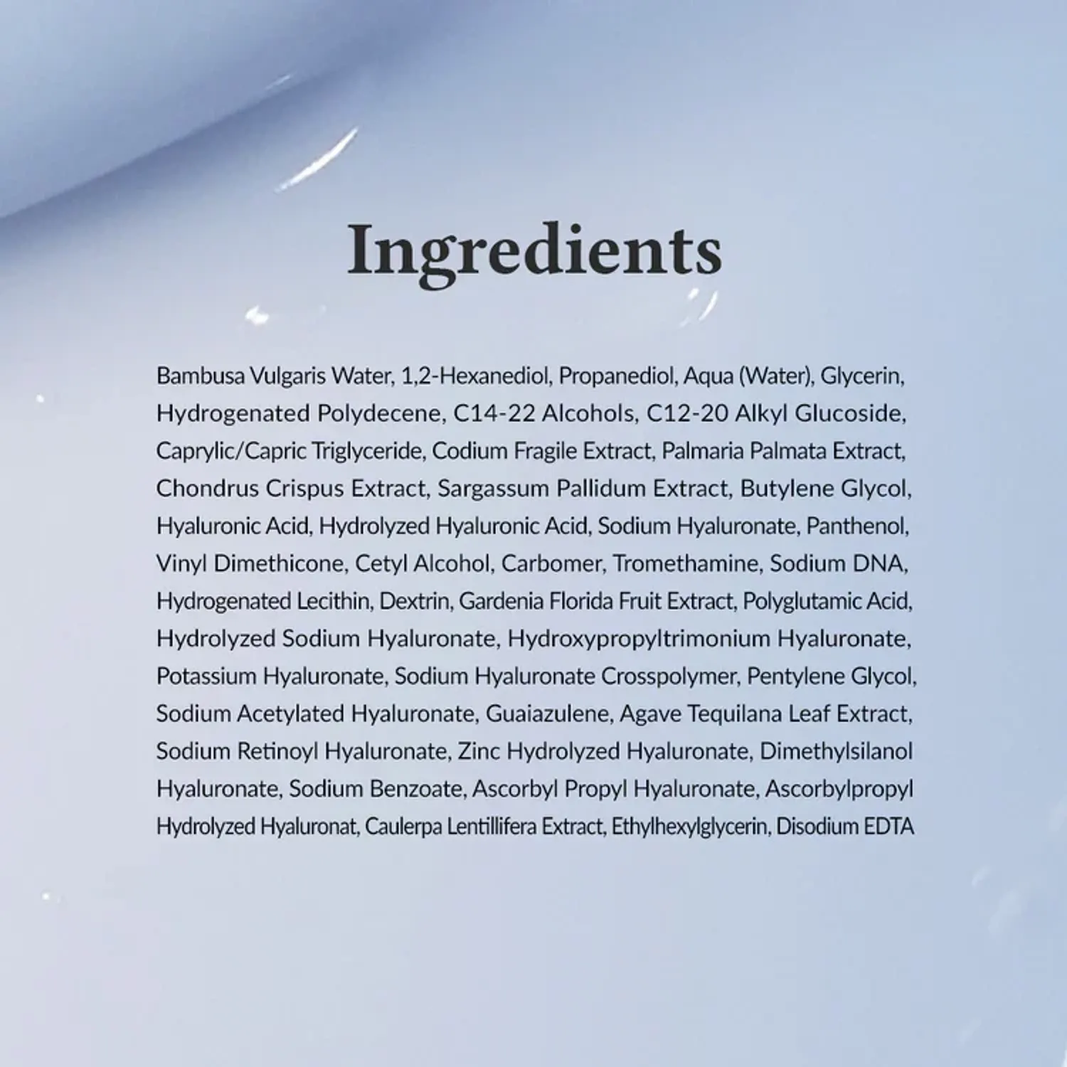 Bambusa Vulgaris Water, 1,2-Hexanediol, Propanediol, Water, Glycerin, Hydrogenated Polydecene, C14-22 Alcohols, C12-20 Alkyl Glucoside, Caprylic/Capric Triglyceride, Codium Fragile Extract, Palmaria Palmata Extract, Chondrus Crispus Extract, Sargassum Pallidum Extract, Butylene Glycol, Hyaluronic Acid, Hydrolyzed Hyaluronic Acid, Sodium Hyaluronate, Panthenol, Vinyl Dimethicone, Cetyl Alcohol, Carbomer, Tromethamine, Sodium DNA, Hydrogenated Lecithin, Dextrin, Gardenia Florida Fruit Extract, Polyglutamic Acid, Hydrolyzed Sodium Hyaluronate, Hydroxypropyltrimonium Hyaluronate, Potassium Hyaluronate, Sodium Hyaluronate Crosspolymer, Pentylene Glycol, Sodium Acetylated Hyaluronate, Guaiazulene, Agave Tequilana Leaf Extract, Sodium Retinoyl Hyaluronate, Zinc Hydrolyzed Hyaluronate, Dimethylsilanol Hyaluronate, Sodium Benzoate, Ascorbyl Propyl Hyaluronate, Ascorbylpropyl Hydrolyzed Hyaluronat, Caulerpa Lentillifera Extract, Ethylhexylglycerin, Disodium EDTA